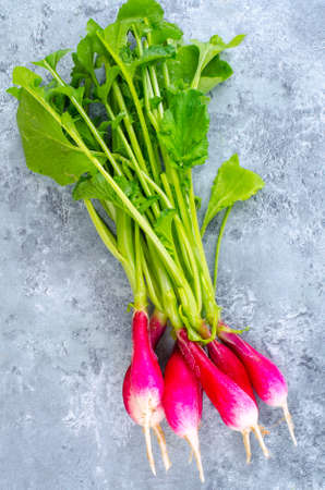 Red salad radish on light background. Red organic radish with a bunch of green tail, copy space. Why to eat radish.