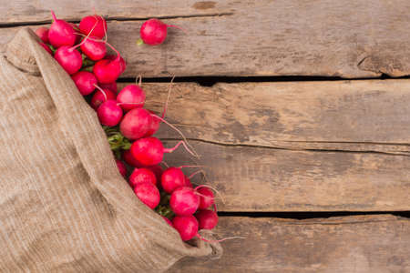 Overfilled sack of radishes on wood. Copysapce. Old wooden desk background.