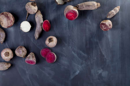 Beetroots and sliced turnip on blackboard from the top