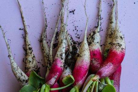 Bunch of Radishes. Freshly harvested, purple colorful radish. Growing Radish. Growing vegetables. Healthy food background.