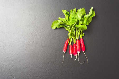 ripe red radish with green tops on dark concrete background