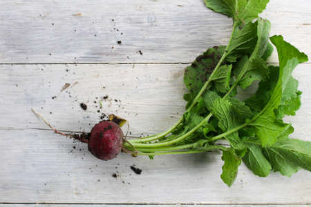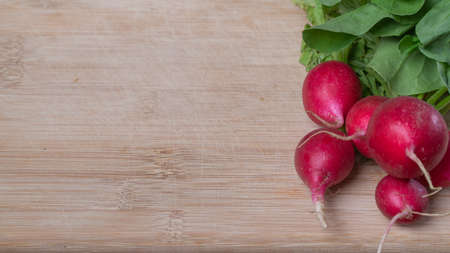 Fresh organic radish vegetable on a wooden tble with copy space
