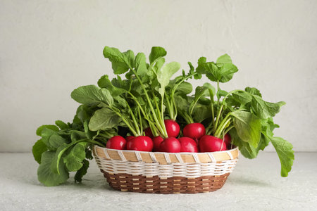 Top view of red ripe radishes in a basket with grunge background