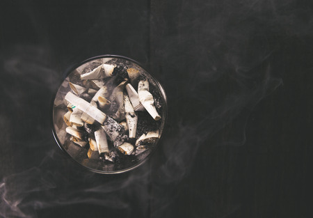 burned cigarette butts in black dirty ashtray
