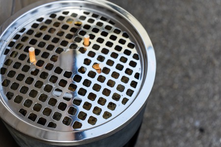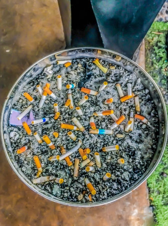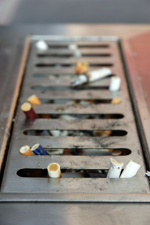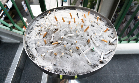 Close up of cigarette butts in a public ashtray