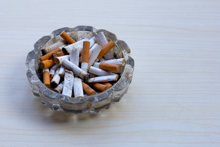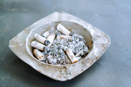 Ashtray filled with cigarette butts shows evidence of smoking.