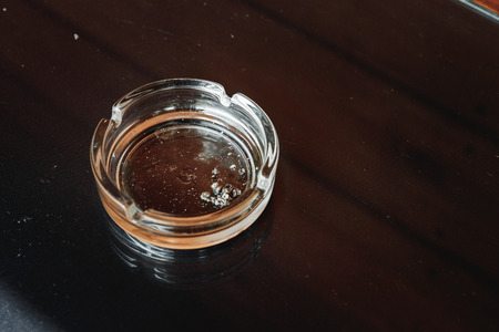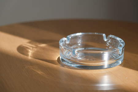 Glass ash tray on brown wooden table with shadow