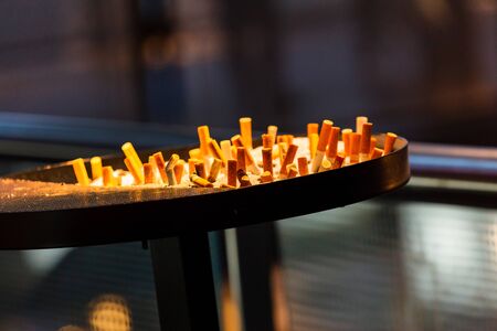 Details of cigarette butt in oriental metal ashtray