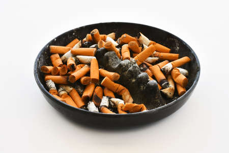 An image of a black ashtray full of dirty old cigarette butts on a white background.