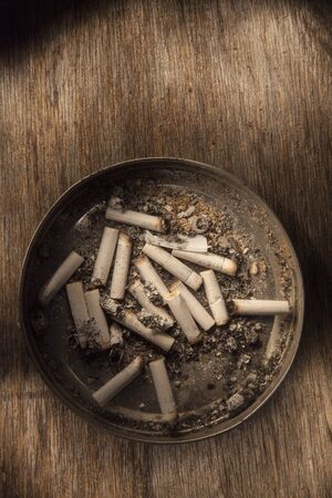 Bangkok,Thailand-Apil 10,2017:Cigarette butt cigarette on Ashtray with sand and cigarette stubs outdoors on wood background.Concept for World No Tobacco Day.