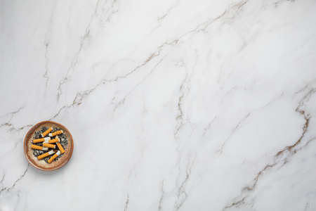 Ashtray in lower left corner on marble background - World no Tobacco Day