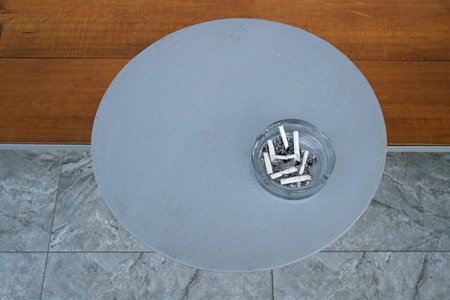 Glass ashtray with cigarette butts on the wooden table