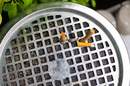 Top view and close up shot with copy space of used cigarettes in metallic ashtray container in square hole texture shows concept of dangerous and harmful impact to health and environment of smoking.