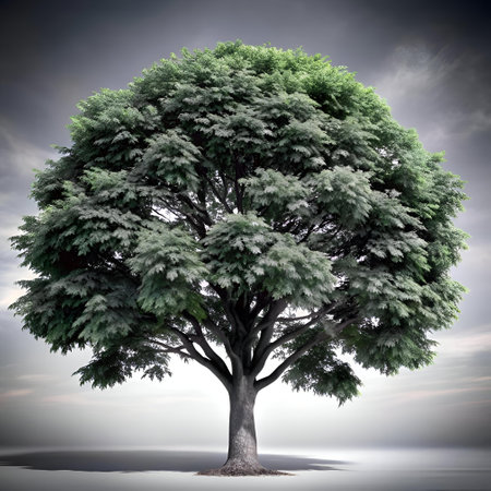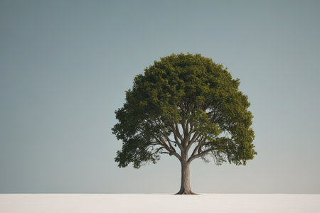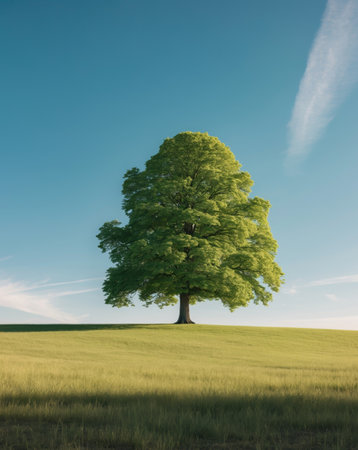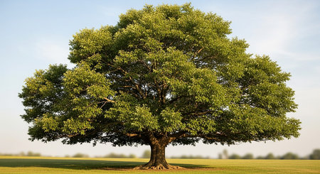 A majestic oak tree with lush green leaves stands alone in serene setting