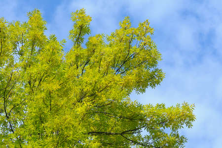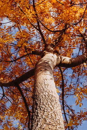 Beautiful autumnal tree with yellow leaves on blue sky background.
