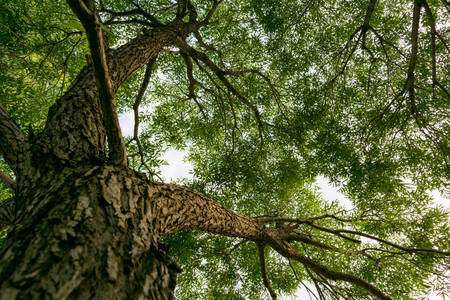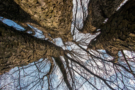 View under tree trunk and branch in the wild