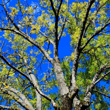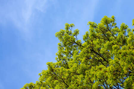 Oak tree with green leaves on blue sky background. Natural background.