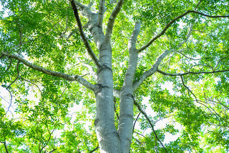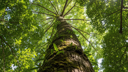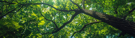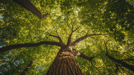 The view from below of a tree canopy, with sunlight filtering through the vivid green leaves, offers a perspective of tranquility and growth.
