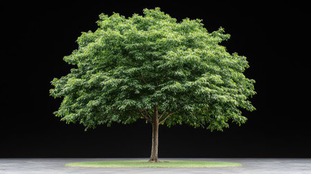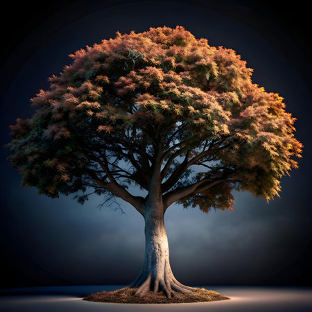 A majestic 3D illustration of a solitary maple tree. bathed in warm light against a dark. moody backdrop. Ideal for nature themed designs. environmental projects. and inspirational imagery.