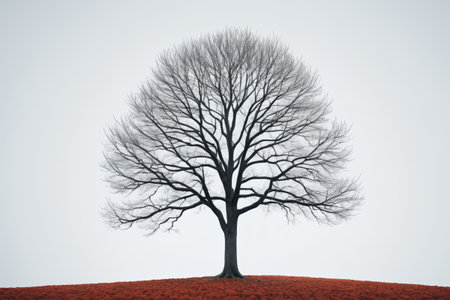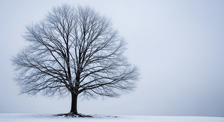 A striking lone tree stands amidst a snow-covered landscape, creating a serene and peaceful winter scene. The empty space enhances its majestic beauty.