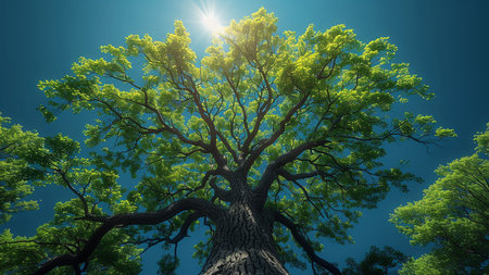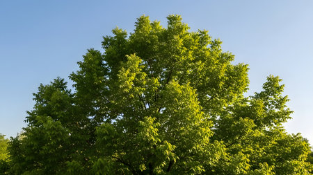 A majestic tree with lush green leaves stands tall against a clear blue sky, its foliage illuminated by sunlight, creating a vibrant contrast between the natural elements.