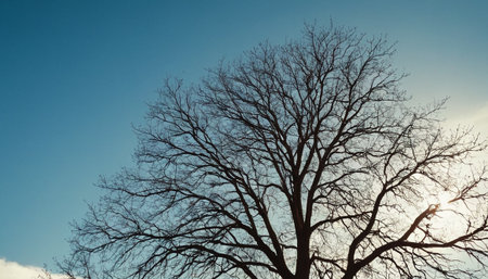 Silhouette of tree branches on blue sky background. Vintage toned