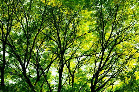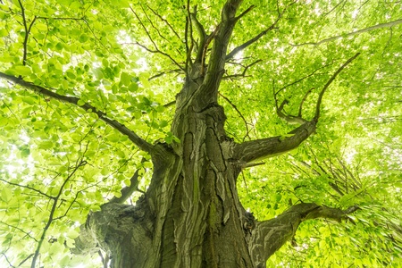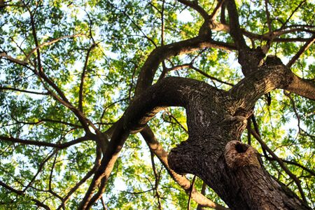 Green forest. Tree with green Leaves and sun light. Bottom view background. View of a tree from below