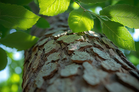 Close-Up View of Tree Bark with Overhanging Green Leaves