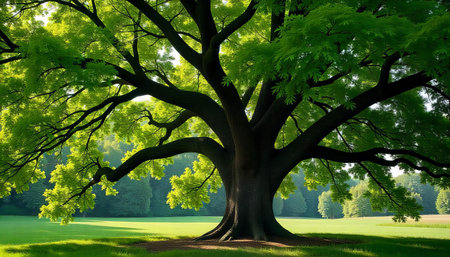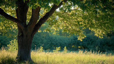 Majestic Tree Bathed in Sunlight and Verdant Foliage. Concept Nature Photography, Tree Silhouettes, Golden Hour Light, Lush Greenery, Landscape Beauty