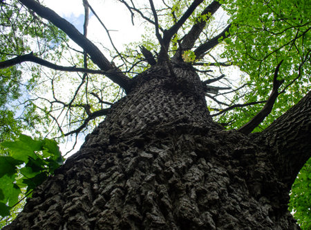 From a worm's-eye view, a thick, ancient tree trunk covered in moss displays its numerous, sturdy branches reaching towards the sky.