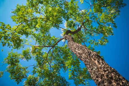 Green Jungle Tree against blue sky, with some withe clouds . Nature Concept. Look Up View in Tropical Forest. Looking up to the sky along a tree trunk. Close up a tropical tree
