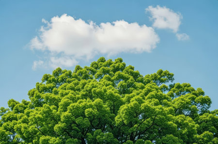 Fresh green tree and blue sky with white clouds, natural background.