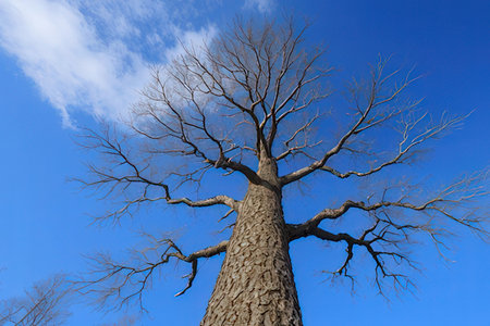 Dead tree on blue sky background, closeup of photo with soft focus