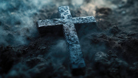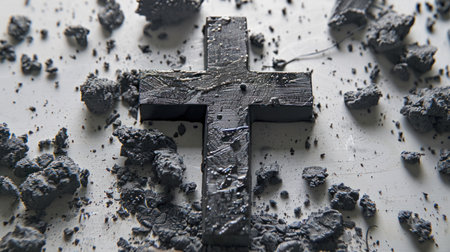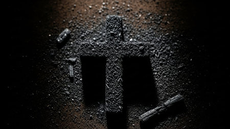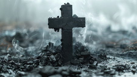 Dark charcoal cross and ash. Symbolic, dramatic, solemn.