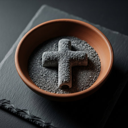 Ash Wednesday cross, ashes bowl, palm frond, religious symbols.