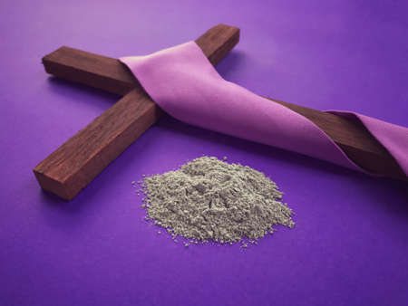 Good Friday, Lent Season, Ash Wednesday and Holy Week concept. Christian cross and ashes on purple background.