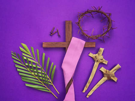 Christianity concept about Ash Wednesday, Good Friday, Lent Season and Holy Week. Holy cross made of palm leaf and a dry palm leaf arranged on purple background.