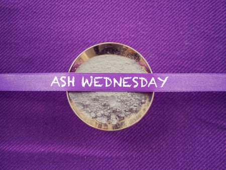 Christianity concept about Ash Wednesday, Good Friday, Lent Season and Holy Week. ASH WEDNESDAY written on a purple ribbon. With blurred style background.