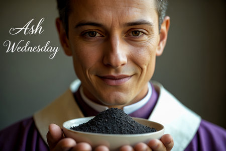 AI Generative Greeting card on Christian religious holiday Ash Wednesday, pastor holds bowl of ashes