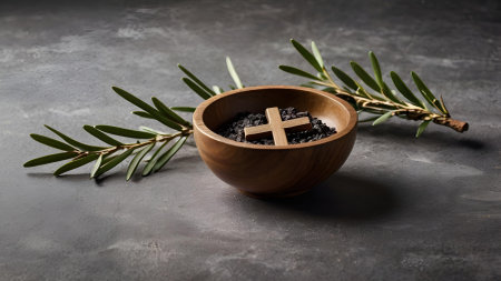 Bowl with ashes, olive branch and cross, symbols of Ash Wednesday