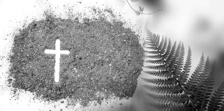 Black ash cross on the ground. Concept of spirituality, Christian rituals, faith, religious, Easter celebration, Lent, ash Wednesday, resurrection, cremation funeral liturgy