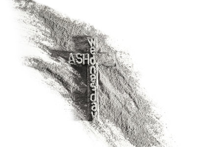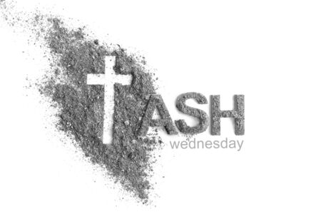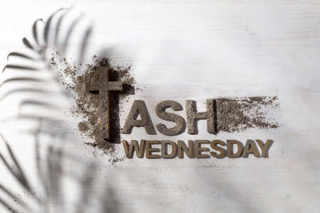 Ash Wednesday, Lent Season and Holy Week concept. Ash Wednesday wording and Christian Holy cross shape on background of scattered ashes.