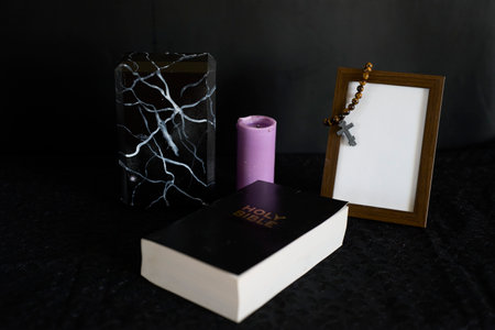 funeral, photo frame, candles, marble urn for ashes, holy bible and spiritual bracelet with black cross