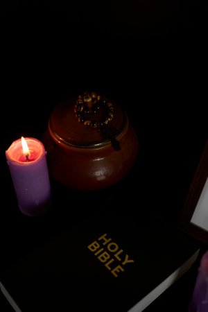 funeral, photo frame, candles, urn for ashes, holy bible and spiritual bracelet with black cross