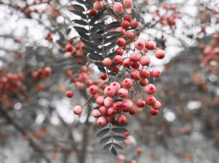 Pink ripe rowan berry on autumn background.
