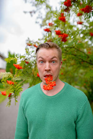 Portrait of young handsome blond man with rowan berries outdoors