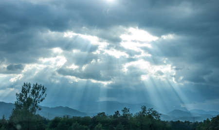 dramatic dark clouds and sun beams landscape