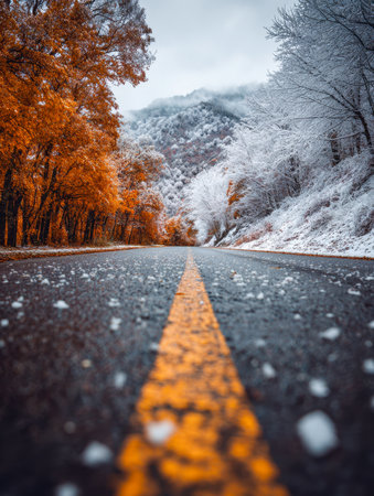 Vibrant orange foliage meets icy branches along a curving mountain path, capturing a harmonious blend of autumn's warmth and winter's chill in tranquil nature.