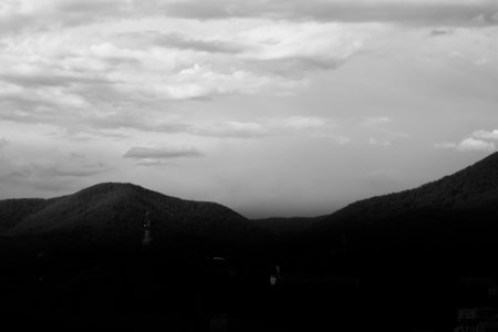 Dramatic cloudy sky over imposing mountains creates a moody atmosphere at dusk