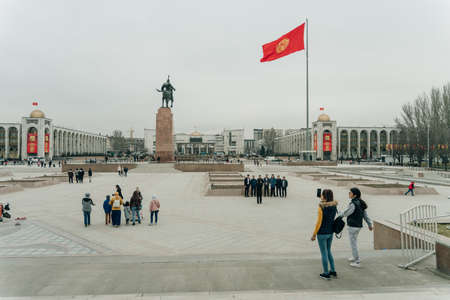 Bishkek / Kyrgyzstan - Feb, 2022 Ala-Too Square with State History Museum and Manas Statue. high quality photo